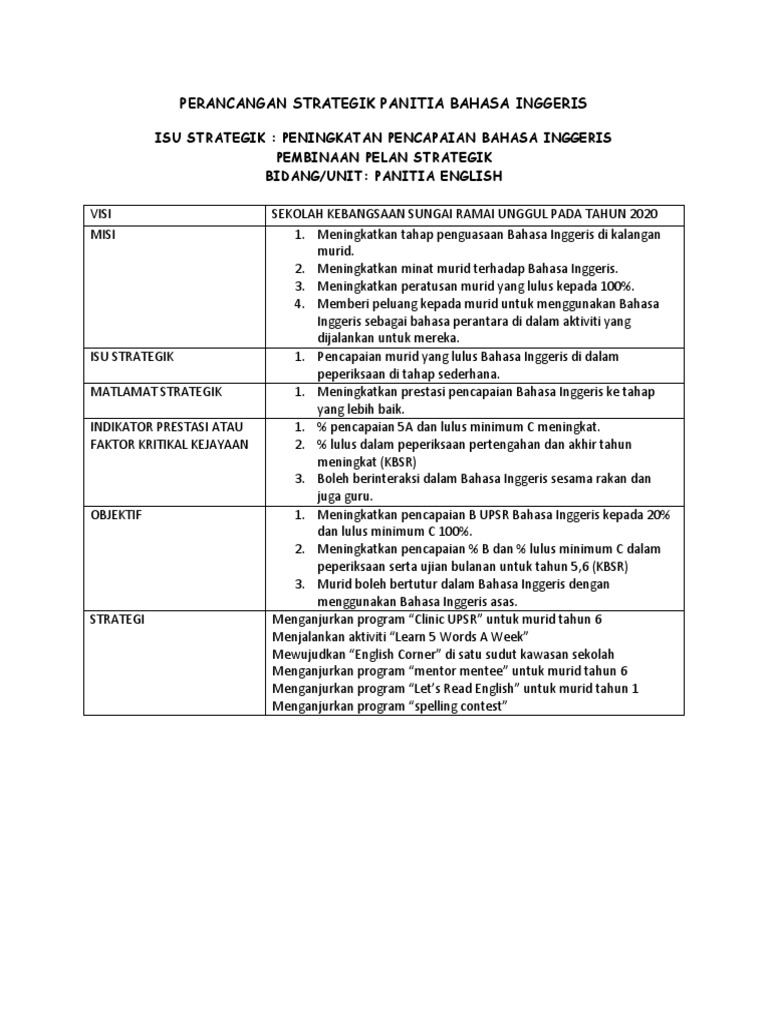 Perancangan Strategik Panitia Bahasa Inggeris Pdf